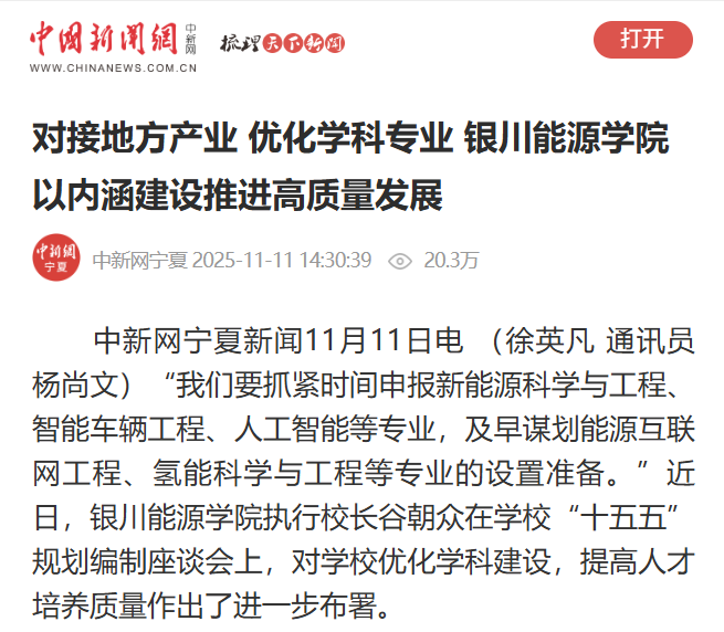 中新网宁夏新闻11月11日电 (徐英凡 通讯员 杨尚文)“我们要抓紧时间申报新能源科学与工程、智能车辆工程、人工智能等专业,及早谋划能源互联网工程、氢能科学与工程等专业的设置准备。”近日,银川能源学院执行校长谷朝众在学校“十五五”规划编制座谈会上,对学校优化学科建设,提高人才培养质量作出了进一步布署.