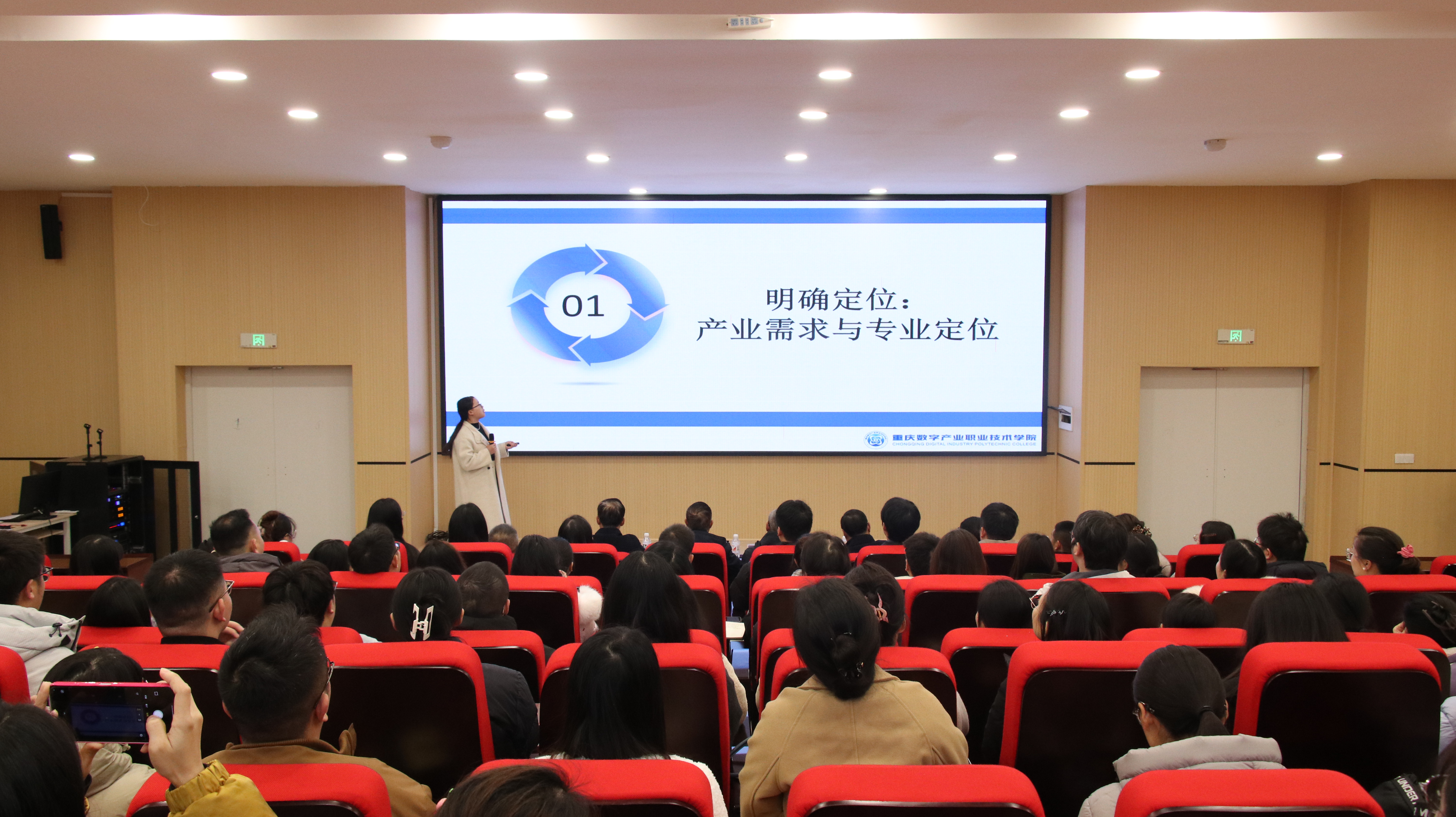 12月9日,重庆数字产业职业技术学院举行教师“说专业”比赛决赛。赛事围绕数字经济背景下技术技能人才需求,搭建起教师展示与交流的专业平台,全面呈现学院在产教融合与教学改革方面的探索成果。重庆数字产业职业技术学院党委书记钟富平、院长何承源、执行院长陈浩等校领导出席评审,全院专兼职教师观摩学习。 决赛现场.