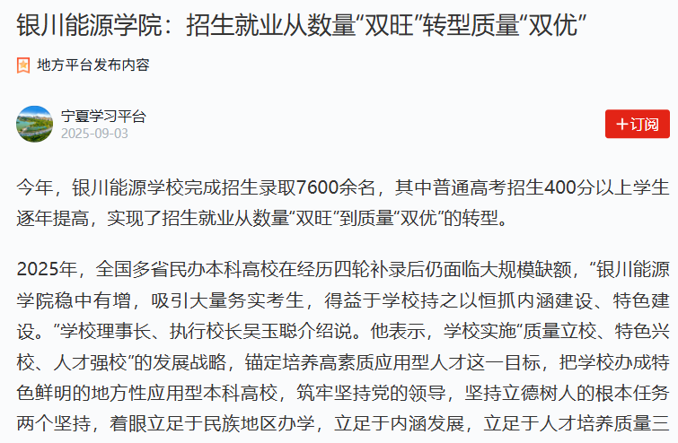 2025年,全国多省民办本科高校在经历四轮补录后仍面临大规模缺额,“银川能源学院稳中有增,吸引大量务实考生,得益于学校持之以恒抓内涵建设、特色建设。”学校理事长、执行校长吴玉聪介绍说。他表示,学校实施“质量立校、特色兴校、人才强校”的发展战略,锚定培养高素质应用型人才这一目标,把学校办成特色鲜明的地方性应用型本科高校,筑牢“坚持党的领导,坚持立德树人的根本任务”两个坚持,着眼“立足于民族地区办学,立足于内涵发展,立足于人才培养质量”三个立足,聚焦“加强专业建设,夯实师资队伍,强化规范管理,确保经费投入和条件保障”四个重点,全面推进学校高质量发展。