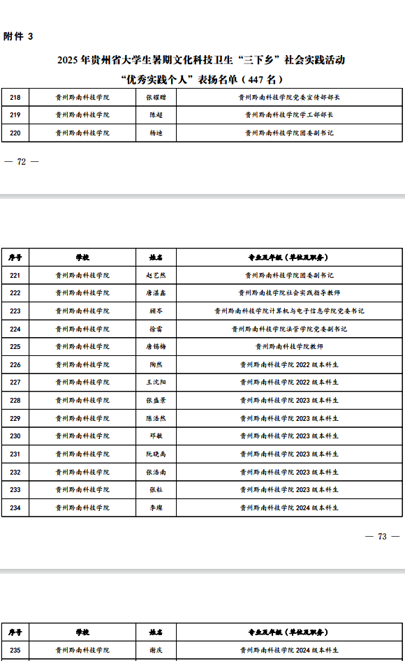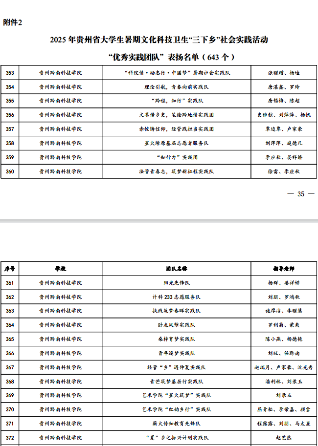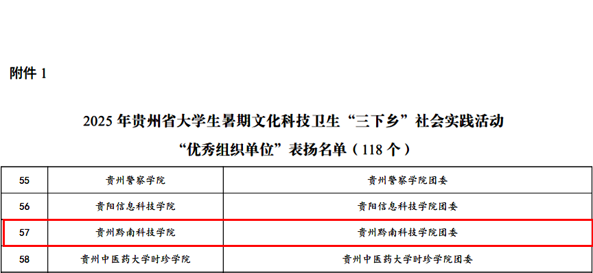 日前,中共贵州省委宣传部、贵州省精神文明办、贵州省教育厅、共青团贵州省委、贵州省学生联合会联合印发《关于2025年贵州省大学生暑期文化科技卫生“三下乡”社会实践活动评审结果的通报》,贵州黔南科技学院获评1个“优秀组织单位”、20个“优秀实践团队”、18个“优秀实践个人”。
