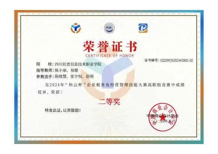此外,她还曾获得全国科云杯企业税务及经营管理技能大赛二等奖、全国大数据分析技能应用大赛三等奖等国家级奖项。