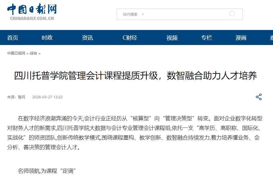 中国日报网 | 四川托普学院管理会计课程提质升级,数智融合助力人才培养
