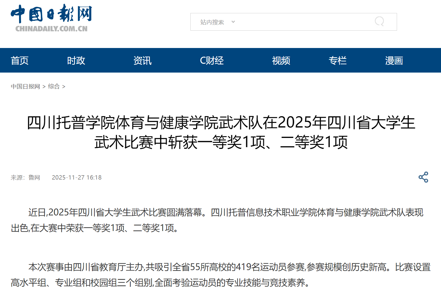中国日报网 | 四川托普学院体育与健康学院武术队在2025年四川省大学生武术比赛中斩获一等奖1项、二等奖1项