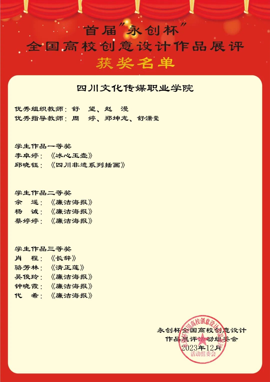 四川文化传媒职业学院学子参加2023年首届“永创杯”(秋期)全国高校创意设计作品大赛获奖