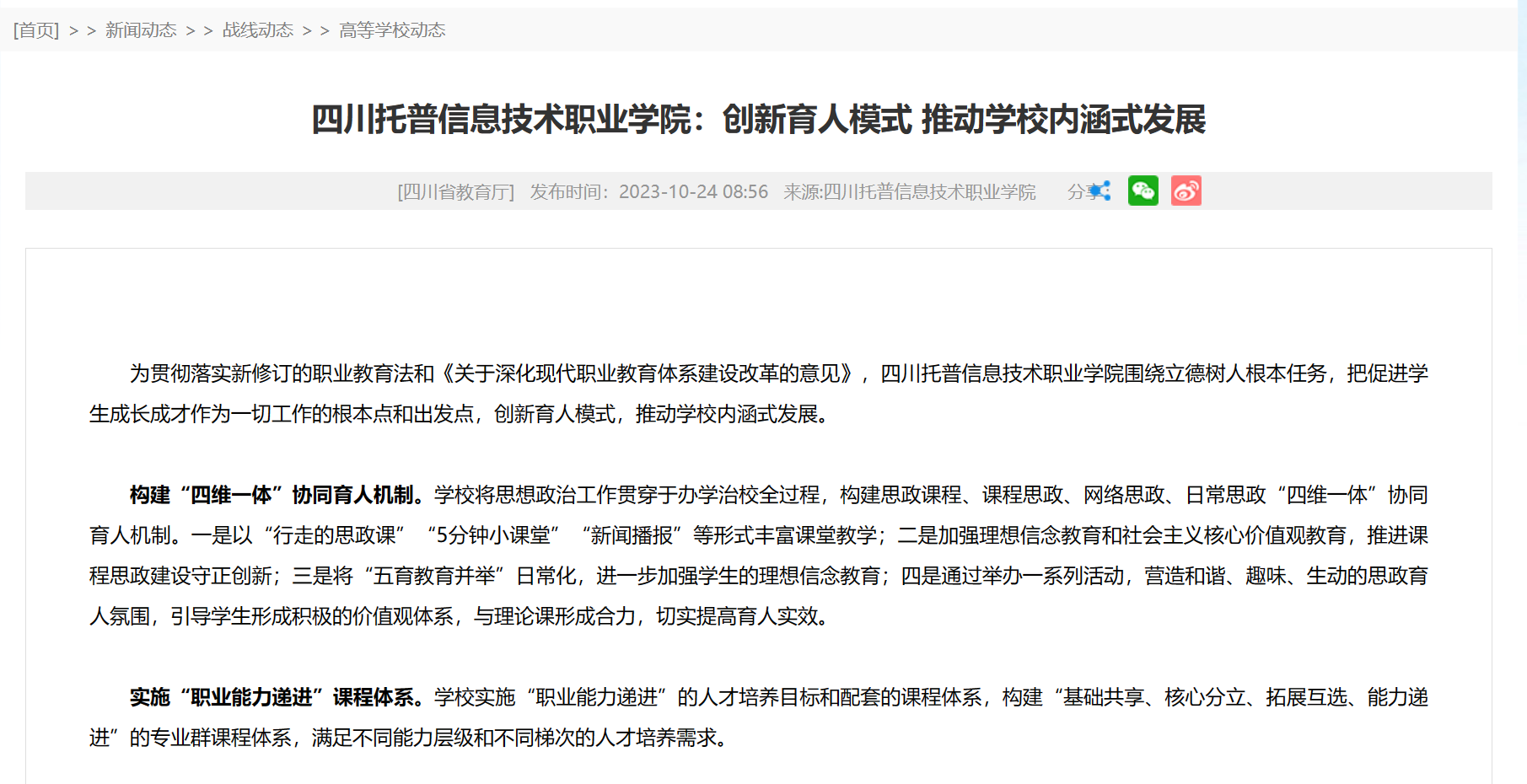 四川省教育厅 | 四川托普信息技术职业学院:创新育人模式 推动学校内涵式发展