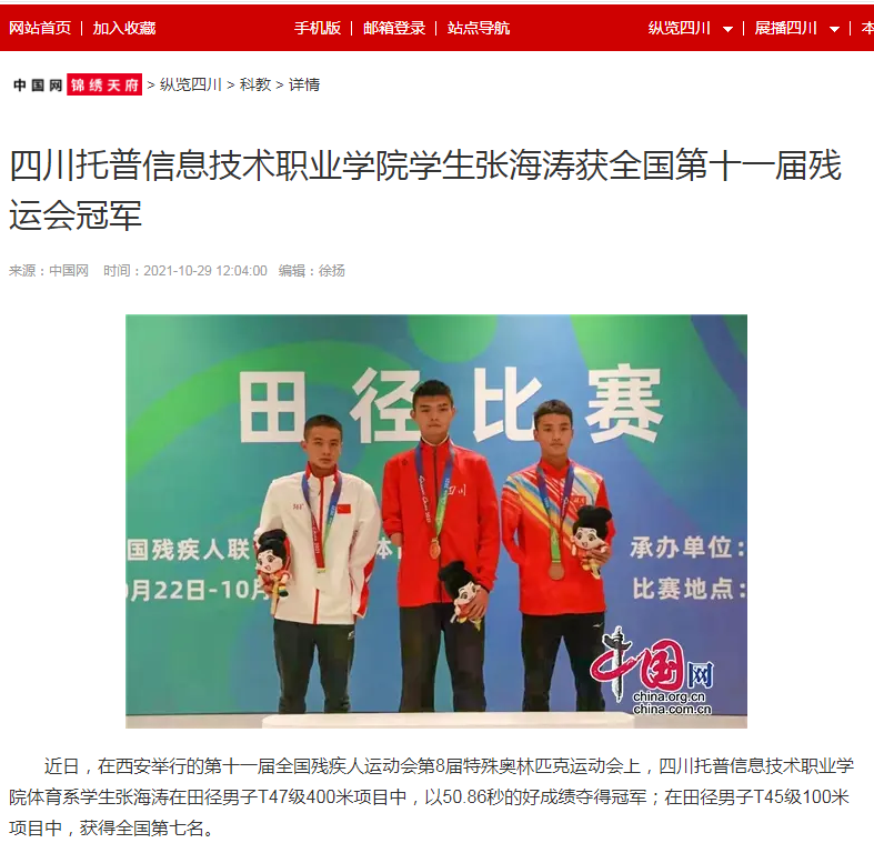 中国网锦绣天府 | 四川托普信息技术职业学院学生张海涛获全国第十一届残运会冠军