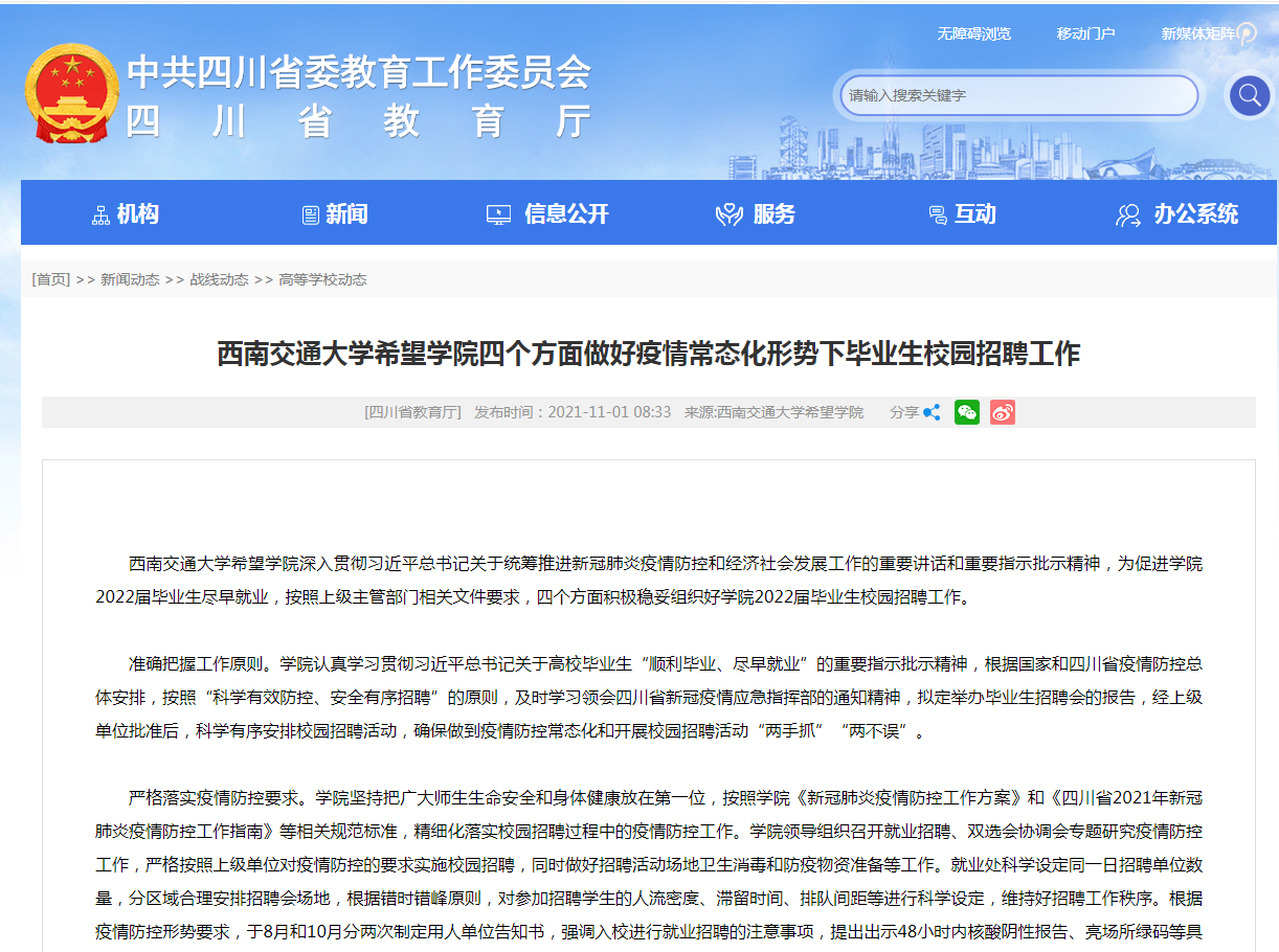四川省教育厅 | 西南交通大学希望学院四个方面做好疫情常态化形势下毕业生校园招聘工作