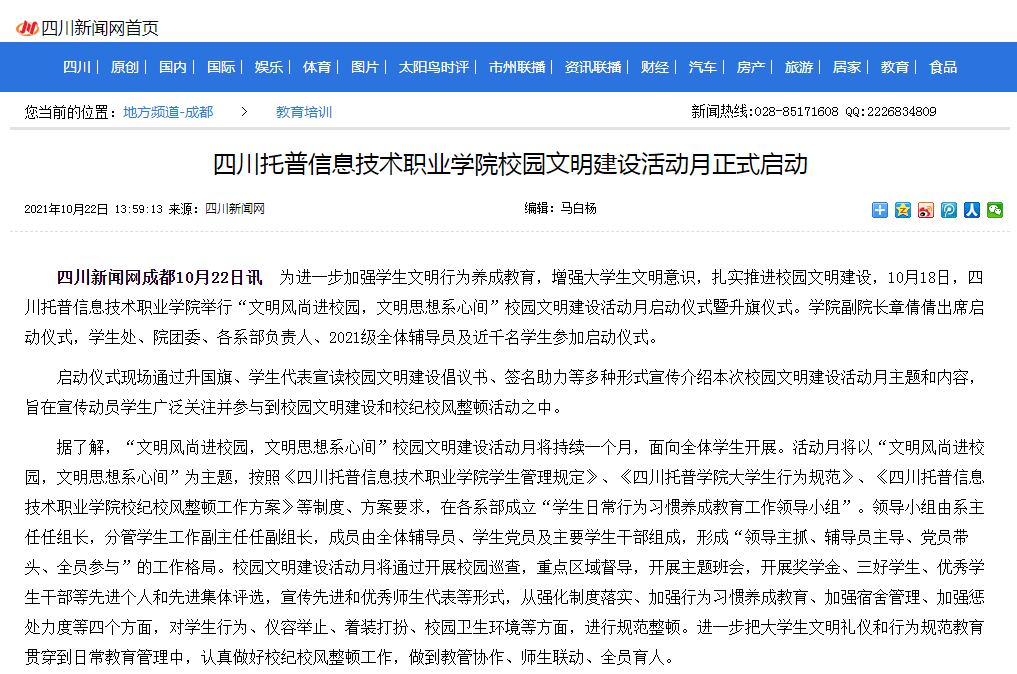 四川新闻网 | 四川托普信息技术职业学院校园文明建设活动月正式启动