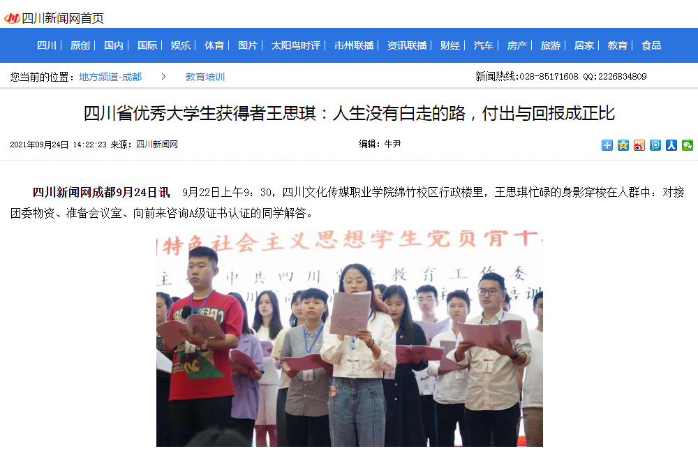 四川新闻网 | 四川省优秀大学生获得者王思琪:人生没有白走的路,付出与回报成正比