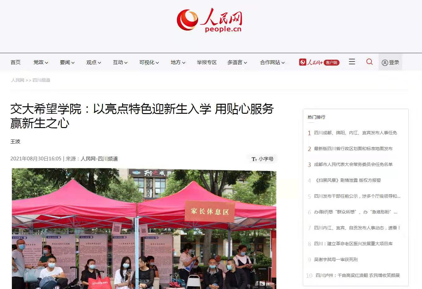 人民网 四川频道 | 交大希望学院:以亮点特色迎新生入学 用贴心服务赢新生之心
