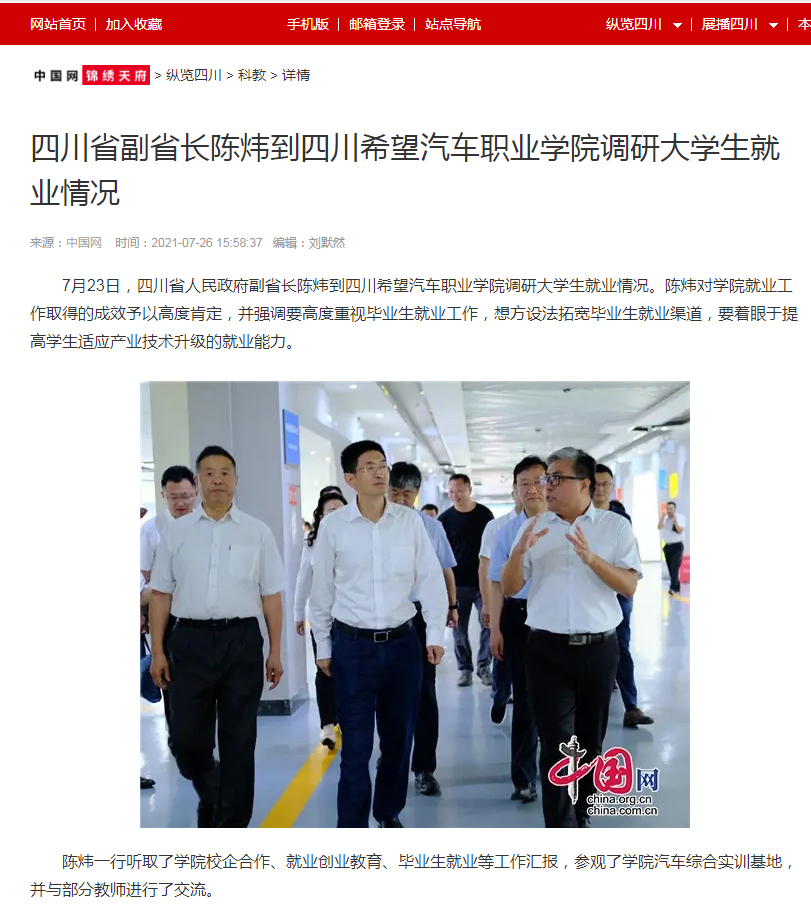 中国网锦绣天府 | 四川省副省长陈炜到四川希望汽车职业学院调研大学生就业情况