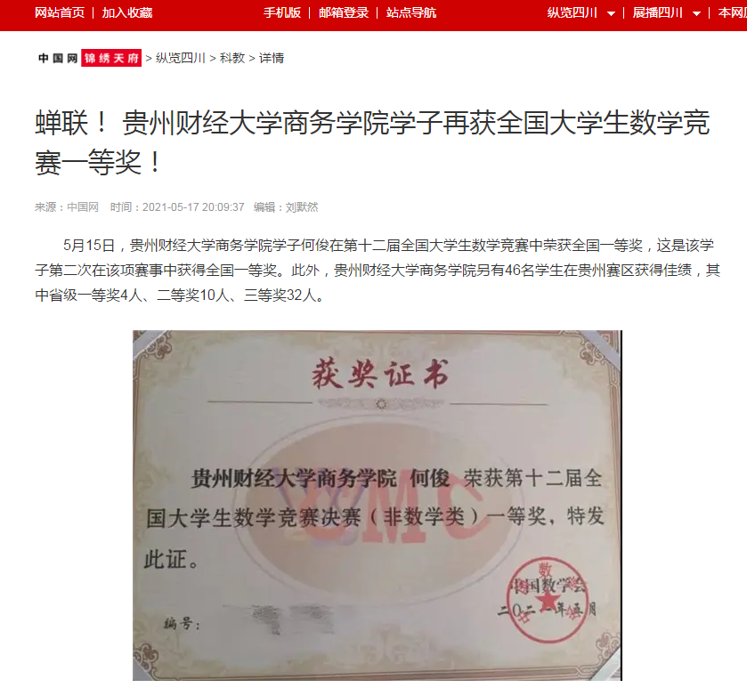 中国网锦绣天府|蝉联! 贵州财经大学商务学院学子再获全国大学生数学竞赛一等奖!