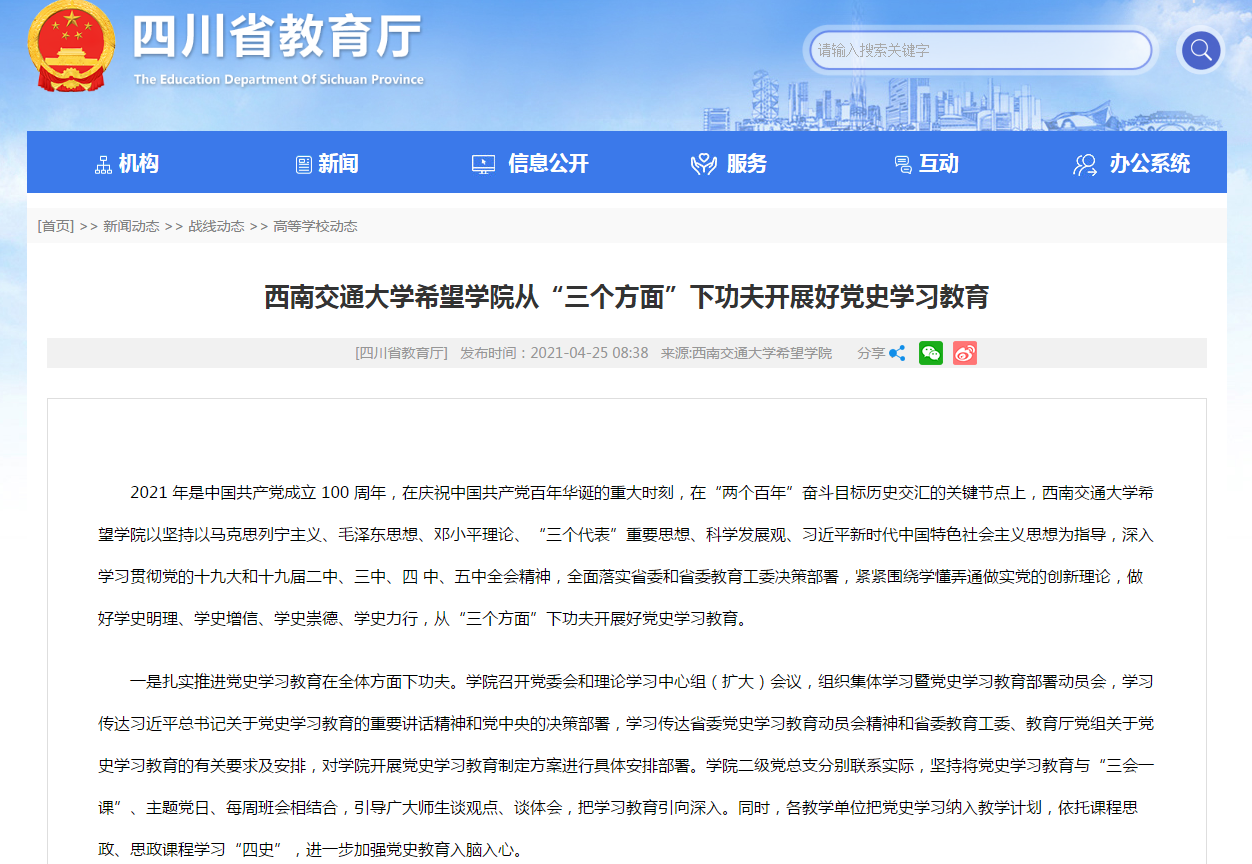 四川省教育厅 | 西南交通大学希望学院从“三个方面”下功夫开展好党史学习教育
