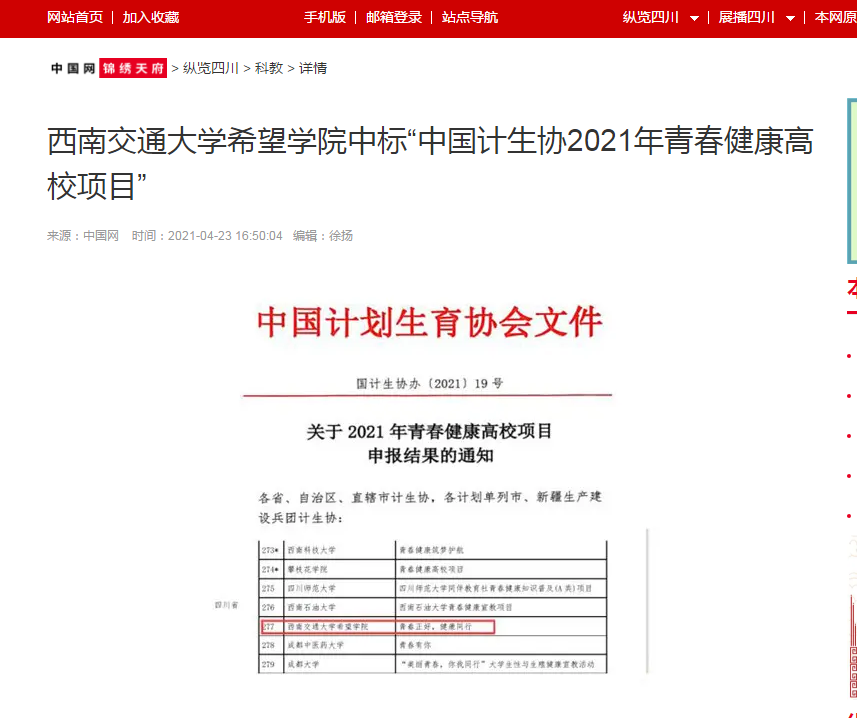 中国网锦秀天府|西南交通大学希望学院中标“中国计生协2021年青春健康高校项目”